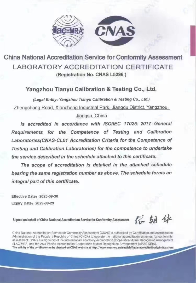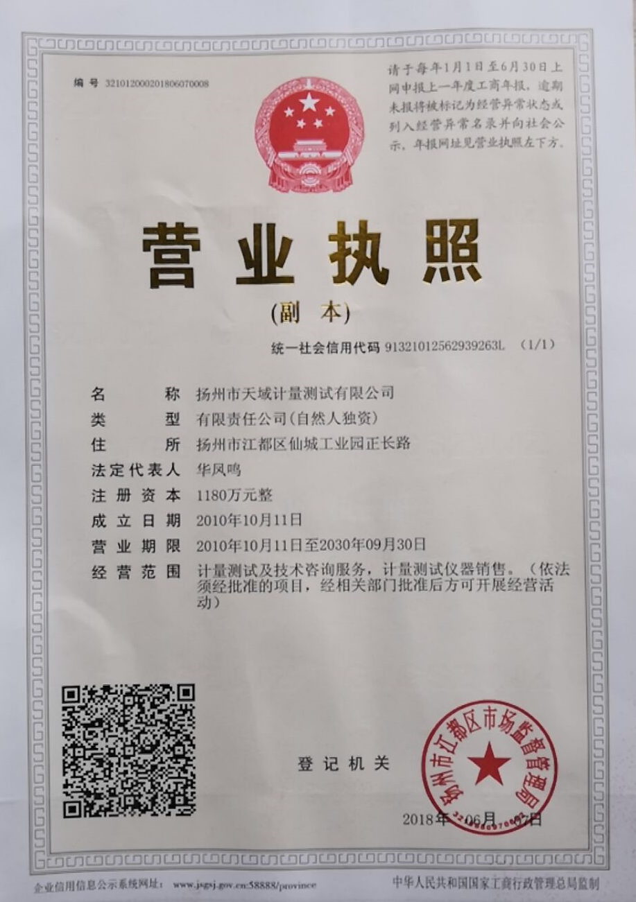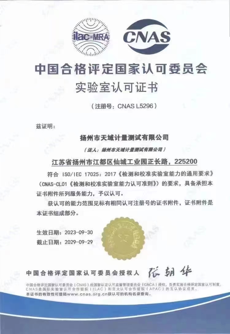 揚(yáng)州市天域計(jì)量測試有限公司,坐落在交通便利的揚(yáng)州市江都區(qū)仙城工業(yè)園,成立于2010年10月,2011年11月正式獲取中國合格評定國家認(rèn)可委員會(huì)認(rèn)可(授權(quán)),注冊號(hào):CNAS L5296。近幾年的發(fā)展,實(shí)驗(yàn)室已具備了較大規(guī)模,并形成了集計(jì)量器具檢測,計(jì)量技術(shù)咨詢和計(jì)量器具銷售為一體的專業(yè)化技術(shù)機(jī)構(gòu),客戶覆蓋蘇南、蘇北、和浙江,安徽部分地區(qū),客戶群總量達(dá)到了上千家企事業(yè)單位。實(shí)驗(yàn)室建立健全了一套較為完整的內(nèi)外部質(zhì)量管理體系,至今未發(fā)生糾紛和客戶投訴事件。